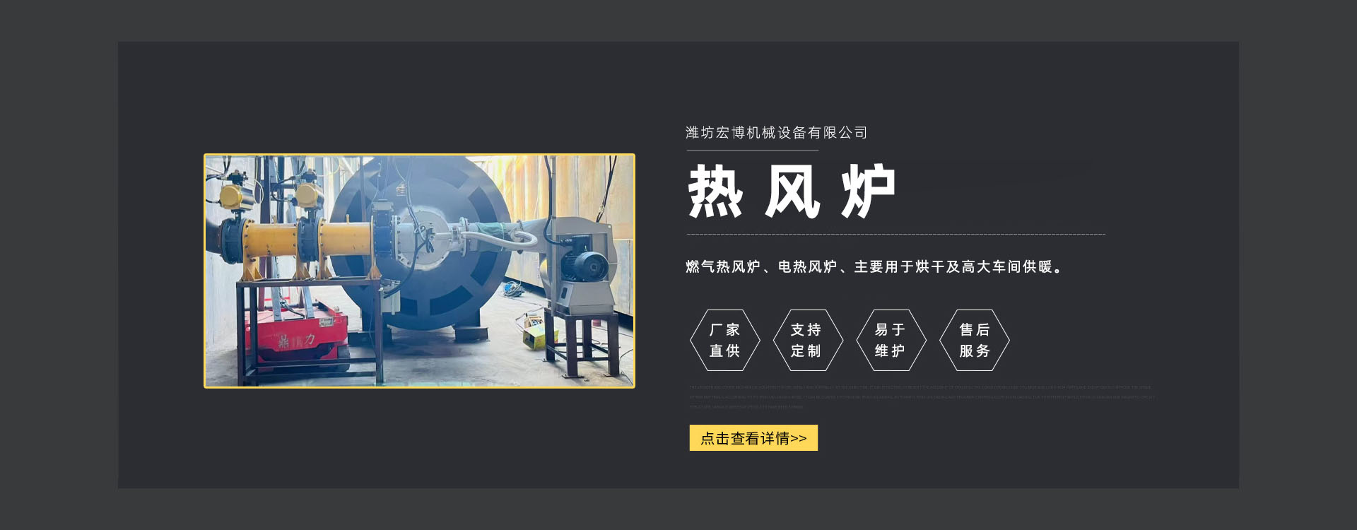 濰坊宏博機(jī)(jī)械設(shè)(shè)備有限公司是從事熱風(fēng)(fēng)爐、烘干設(shè)(shè)備、供暖設(shè)(shè)備的研發(fā)(fā)、設(shè)(shè)計(jì)(jì)、制造和服務(wù)(wù)于一體的實(shí)(shí)體企業(yè)(yè)。長(zhǎng)期以來,企業(yè)(yè)以市場(chǎng)的發(fā)(fā)展和客戶的需求為導(dǎo)(dǎo)向,集多年的生產(chǎn)(chǎn)技術(shù)(shù)與經(jīng)(jīng)驗(yàn)(yàn)為一體,不斷開發(fā)(fā)和優(yōu)(yōu)良產(chǎn)(chǎn)品。